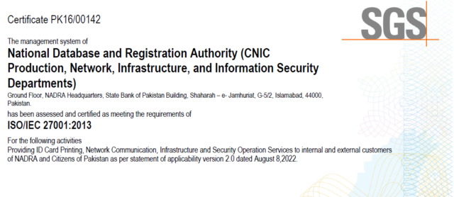 Congratulating team, Chairman NADRA Tariq Malik said, “International Standards Organization certification reflects that NADRA processes of managing its ID assets are governed by international standards, as endorsed by third party audit.”