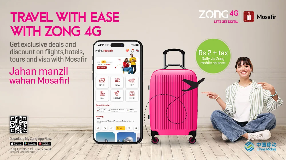 Calling all travel enthusiasts across Pakistan! Zong, Pakistan’s leading technology innovation company, has partnered with Mosafir to bring you an exclusive travel subscription service like never before. This exciting partnership unlocks premium travel perks for Zong users for just Rs. 2 + tax per day; including discounted rates on flights, hotels, Umrah, and tour bookings, early access to limited-time promotions, and enhanced customer care. Whether you’re booking domestic or international flights, reserving hotels, planning tours, or seeking visa consultancy, it’s all now available through one seamless, easy-to-use platform. Get ready to travel smarter, easier, and better with Zong and Mosafir!